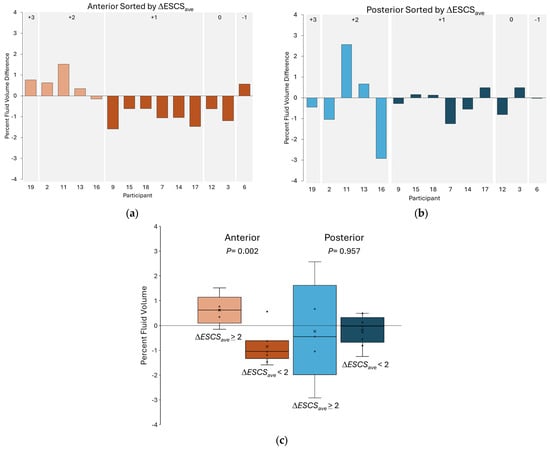 We arbitrarily separated participants into two groups: those with ≥2 points ESCSave difference pre-modification to post-modification (n = 5) and those with <2 points difference (n = 9). The mean increase in the anterior region limb fluid volume was 0.6% for the ≥2 points group and −0.9% for the <2 points group (p = 0.002) and the mean increase in the posterior region was −0.2% for both groups (p = 0.957) (Figure 6c).
