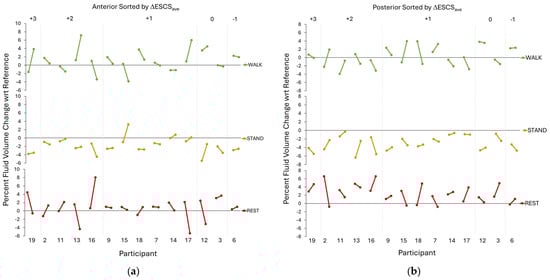 Inspection of fluid volume changes during stand, walk, and rest (Figure 7a,b) demonstrated that no single one of these activities dominated the observed pre-modification to post-modification changes. All fluid volume changes in the posterior region during standing were negative, indicating a fluid volume loss.