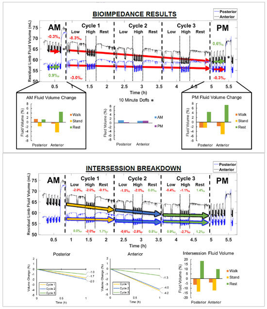Example limb fluid volume results for clinical visualization. Participant 3. Blue and green numbers above and below the data plots indicate percentage fluid volume change. Upper panel: Red arrows indicate an AM or PM session fluid volume loss. Green arrows indicate an AM or PM session fluid volume gain. * = prosthesis doffed. Lower panel: Arrows indicate direction of fluid volume change for Cycle 1 (yellow), Cycle 2 (blue), and Cycle 3 (green). Bottom three graphs: Percent fluid volume change by cycle for posterior and anterior regions, and percent fluid volume change by activity during the intersession.