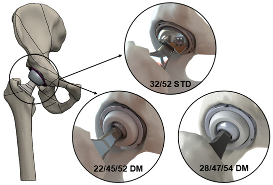 Components based on the geometries of the Pinnacle® THA system (DePuy Synthes; Raynham, MA, USA) were modeled using a commercially available computer-aided design (CAD) software package (SOLIDWORKS 2022; Waltham, MA, USA). Three uncemented acetabular cup combinations, including one standard and two modular DM devices, were considered, which were dimensionally suited for the same size of acetabulum (Figure 1). The standard implant featured a 52 mm outer diameter (OD) shell, a 32 mm inner diameter (ID) neutral polyethylene liner, and a 32 mm OD femoral head (32/52STD). The DM implants comprised the following: (a) a 52 mm OD modular shell with a 45 mm ID metal liner insert, a 45 mm OD/22 mm ID polyethylene mobile bearing, and a 22 mm OD femoral head (22/45/52DM); and (b) a 54 mm OD modular shell with a 47 mm ID metal liner insert, a 47 mm OD/28 mm ID polyethylene mobile bearing, and a 28 mm OD femoral head (28/47/54DM). All components were paired with a collarless Corail® size 12 femoral stem.