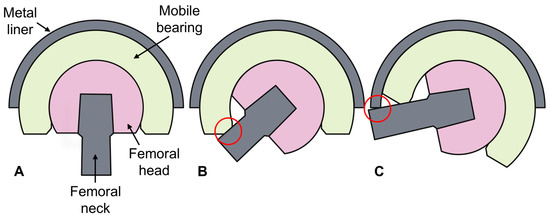 Dual mobility implant in a neutral orientation (A) and during the two types of contact interactions which can occur—femoral neck–mobile bearing contact (B) and impingement (C).