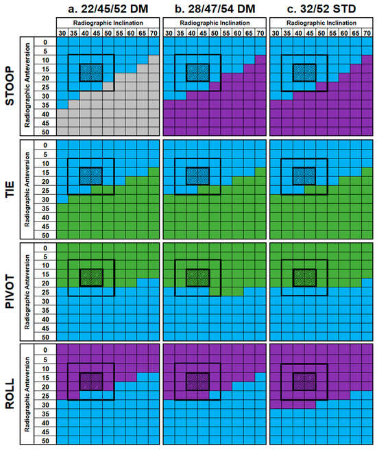 Result matrices showing impingement for the standard and DM constructs during four activities—STOOP, TIE, PIVOT, and ROLL. Cells are colored based on the type of impingement which occurred—implant–implant (blue), implant–bone (gray), bone–bone (purple), or none (green). Each matrix has a shaded 2 × 2 box, which represents the manufacturer’s instructions for implantation, as well as a broadened, outlined 4 × 4 box, which represents a more likely range of implantation angles.