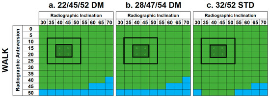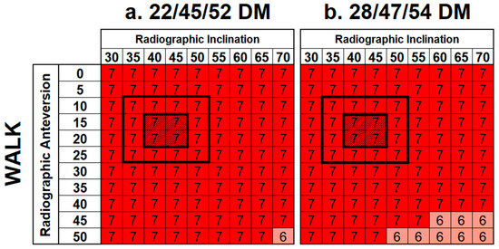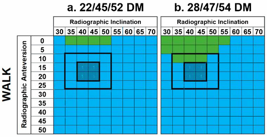 A total of 1584 cases were investigated, yielding 16 results matrices [16]. Summary matrices for DM femoral neck–mobile bearing contact are shown in Figure 7. For both DM constructs, neck–mobile bearing contact occurred during all activities and shell orientations, with the exception of XLG, at high inclination and anteversion angles. Similarly, femoral neck–mobile bearing contact occurred with most shell orientations during walking (Figure 8), except in some low-anteversion orientations.