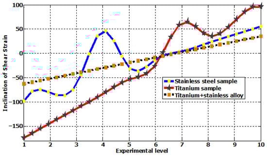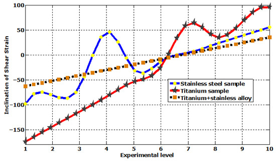 Kinematic hardening is employed as an alternative to the isotropic hardening law in scenarios where components experience cyclic stress, as the latter is typically ineffective [54,55]. The current model fails to consider the Bauschinger effect, leading to the prediction that the solid will undergo a hardening process and eventually exhibit purely elastic behavior after a limited number of cycles. To accommodate the displacement of the center of the yield locus to a specific position inside the stress space, a modification is made to the von Mises yield criterion [22]. Figure 1 illustrates the relationship between maximum shear strain values on different types of metals. Figure 2 demonstrates the inclination of shear strain on the different metals employed. In comparison, maximum shear strain for different metals is depicted in Figure 3.