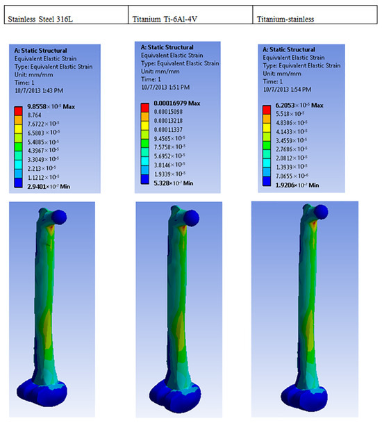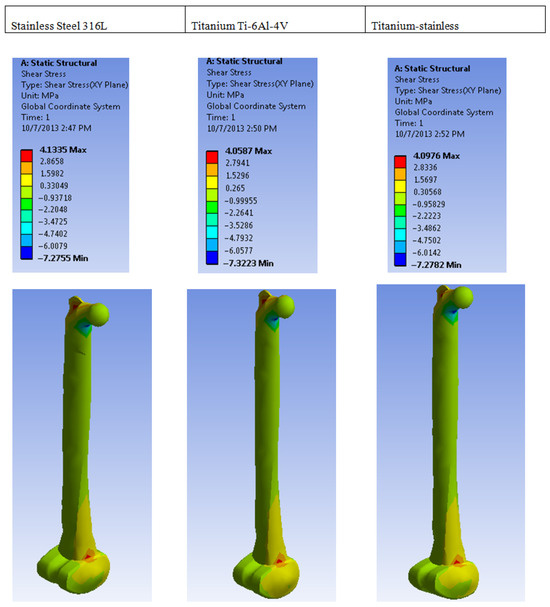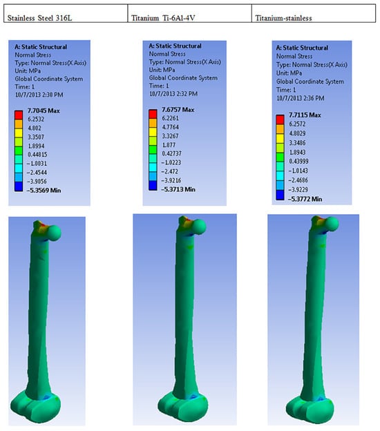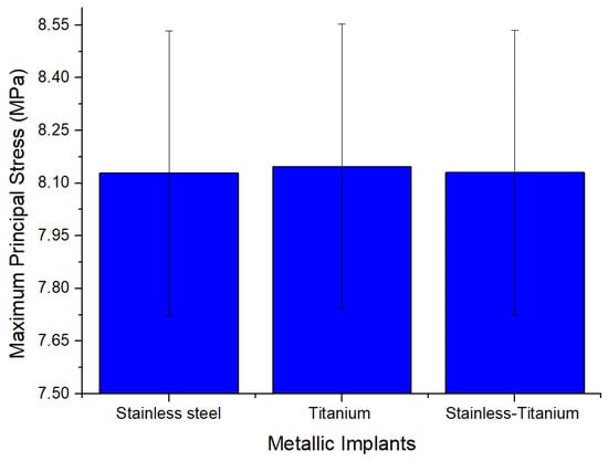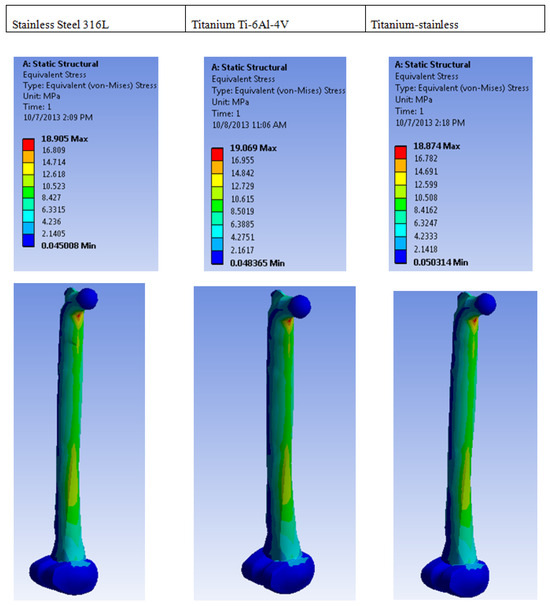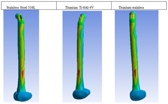 In comparison, 316 stainless steel has a lower resistance to shear strain, while titanium has the least resistance. Therefore, combining these two metals would result in a superior material choice [49,53]. The analysis of maximum principal stress on different metals employed is displayed in Figure 4, while its rear view is depicted in Figure 5.