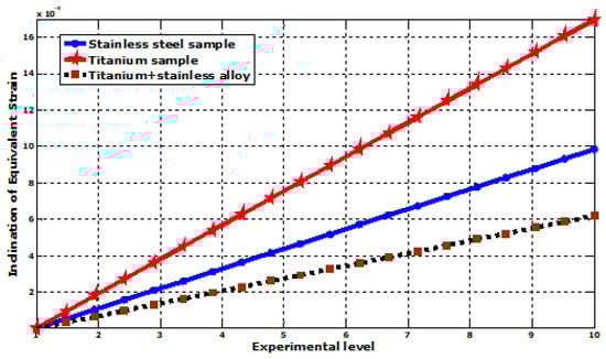 The following values represent the most significant primary stress produced, measured in megapascals (MPa). As such, the three metals exhibit a commendable ability to withstand the created stress, as shown in Figure 6 (maximum stress values), with no notable variation observed [2,19]. The material known as stainless, at 5% error bar, has a tensile strength of 8.1281 ± 0.40641 MPa, followed by titanium stainless with a tensile strength of 8.130 ± 0.4065 MPa and then titanium with a tensile strength of 8.1466 ± 0.40733 MPa. Both stainless steel and titanium have demonstrated remarkable yield strength, as evidenced in the literature. From Figure 6, it is evident that stainless steel exhibits the lowest level of stress generated after loading. This may be attributed to its greater modulus of elasticity, which is 190 GPa, compared with titanium’s modulus of 116 GPa. Consequently, materials with higher moduli are more effective in resisting stress. This is considered a negative feature. Therefore, it can be deduced that titanium stainless has contributed to bridging this gap by demonstrating superior stress resistance when compared with titanium, with a lower modulus of 76 GPa [17,19]. The equivalent elastic strain analysis on different metals is illustrated in Figure 7, where the inclination of equivalent strain is shown in Figure 8.