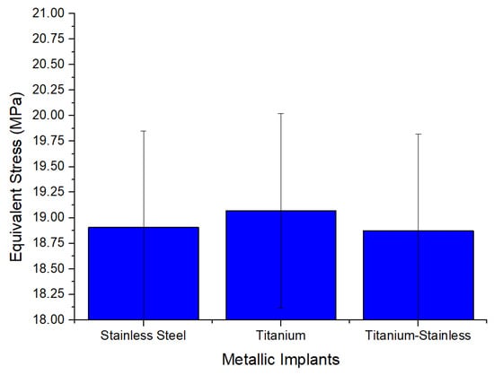The following values represent the stress created and measured in MPa. As such, and similar to the case of maximum primary stress, the three metals exhibit a high level of resistance to the equivalent stresses created, as shown in Figure 11, which are closely aligned. The material with the lowest value at 5% error bar is titanium stainless, which has a value of 18.874 ± 0.9437 MPa. Stainless has a slightly higher value of 18.905 ± 0.94525 MPa, while titanium has the highest value of 19.069 ± 0.95345 MPa. When considering this study, one immediately thinks of the impressive yield strength of stainless steel and titanium, as documented in the literature [2,3,4,5,19,20]. Upon reviewing the graph once more, it is evident that titanium stainless is the most favorable material to be considered, with stainless and titanium being the least favorable. The analysis of the everyday stresses on the different metals studied is illustrated in Figure 12.