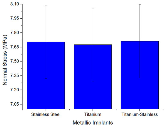 Figure 13 shows the magnitude of the normal stress generated, measured in megapascals (MPa). The ensuing dialogue is presented below: Titanium-stainless is typically disregarded in terms of regular stress [19]. It has the highest stress level produced, which is more of a drawback than a benefit. It was noted that the highest normal stress was observed in titanium stainless steel with the value of 7.7115 ± 0.38557 MPa at 5% error bar, followed by stainless steel with the value of 7.7045 ± 0.38522 MPa and the least of the normal stress was observed in titanium, with the value of 7.6757 ± 0.38379 MPa. Titanium, a substance with lower yield strength, was selected as the preferred material for this study (see Figure 14).