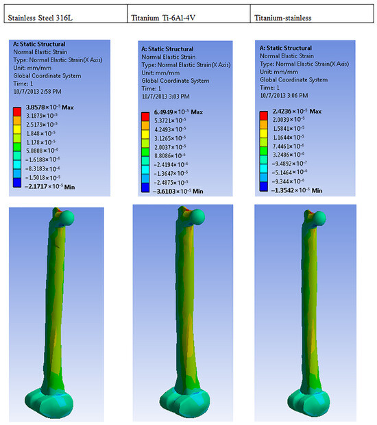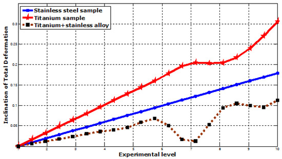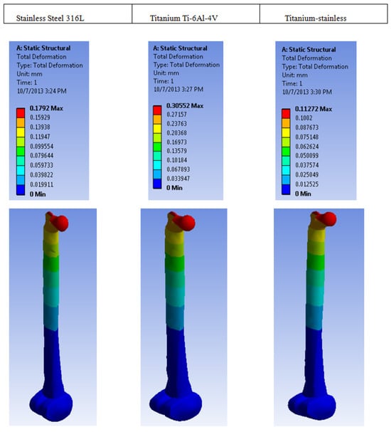 Titanium stainless exhibits the least deformation of the three materials examined (See Figure 19 and Figure 20). This suggests that, for an equivalent load, both stainless steel and titanium would undergo significant deformation, which would not be advantageous in load-bearing applications [23,55]. Consequently, titanium stainless demonstrates superior resistance to deformation [56] and is therefore considered the exceptional material. In addition, the combination of titanium’s and stainless steel’s superior fatigue resistance renders titanium stainless a more suitable material for this investigation. Figure 20 illustrates that titanium stainless steel is more deformation resistant when subjected to load.