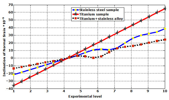 It is widely acknowledged that titanium exhibits a notably low resistance to shear and wear (See Figure 14). On the other hand, stainless steel offers greater resistance and relatively low wear. Our goal is to strike a balance between these two properties. Based on the graph, stainless steel exhibits the highest shear stress value, followed by titanium stainless steel, with titanium having the lowest. This implies that titanium stainless may serve as a connecting element for these characteristics. Figure 15 shows the analysis results of the normal strains on the different metals used.