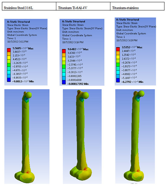 Units of dimensionlessness (mm/mm) are utilized to represent the normal strain values. After a load was applied, titanium stainless exhibited the least elasticity of strain, as depicted in Figure 16, suggesting that it can withstand greater loads than titanium and stainless steel. Analysis results of shear strain on different metals employed are shown in Figure 17.
