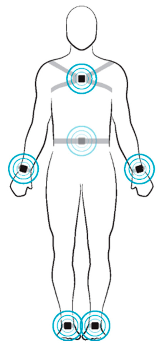 Balance: Participants were fitted with inertial measurement units (IMU) (Opals, APDM Wearable Technologies, Portland, OR, USA) on the right and left wrists and feet, around the waist at the fifth lumbar, and around the chest at the sternum (Figure 1). Participants stood with arms at their sides and feet in a natural position 150 cm from a wall. They were then asked to focus on a small square (approximately 5 × 5 cm) while maintaining balance for 30 s. After a short rest, participants again balanced for 30 s in the same position but with eyes closed. Mobility Lab software by APDM (version 2.0.0.202206161544) was used to assess CoP path length with eyes open (PLEO) and closed (PLEC), as well as CoP velocity with eyes open (VEO) and eyes closed (VEC).