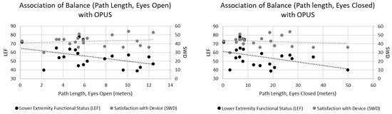 This study identified that in persons wearing prosthesis, there was an association of longer CoP path length during both conditions and LEF of the OPUS. However, this association was not observed for CoP velocity. The moderate correlation between CoP displacement and LEF in lower limb prosthesis users, but lack of correlation with CoP velocity, can be explained by considering the biomechanical and functional significance of these measures, as well as the nature of the LEF as a patient-reported outcome. CoP displacement reflects the extent of postural sway or the range of movement of the body’s center of pressure during standing or functional tasks. Larger CoP displacement in our participants may indicate challenges in maintaining balance, compensating for prosthetic limb limitations, [20] or reduced confidence in weight-bearing on the prosthetic side [21]. However, these variables were not evaluated in the current study. The LEF assesses perceived functional ability in activities like walking, stair climbing, and standing, which are directly influenced by balance and stability. We observed moderate scores of LEF of 58.6 and 48.0 for LU and AO participants, respectively. Others have observed scores of 45.7 [22], 55.1 ± 4.4, [23], and 51.53 [24]. Taken together, these results suggest a trend of moderate self-reported functional mobility in lower limb prosthesis users.