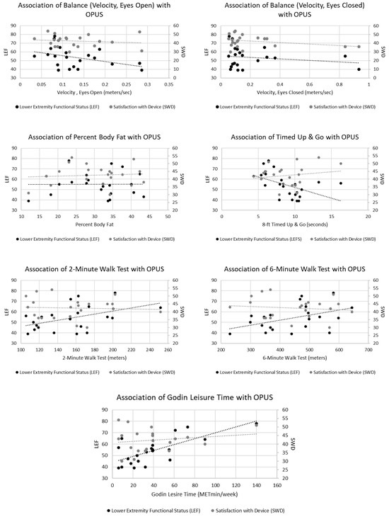 Although the OPUS does well as a self-reported outcome measure of function, satisfaction and quality of life, its association with other measures of habitual physical activity, functional mobility, and body composition are still unknown. The purpose of this study was to examine the association between OPUS and a battery of patient reported and performance-based outcome measures in lower limb prosthesis users. It was hypothesized that functional and balance performances would be associated with better OPUS scores.