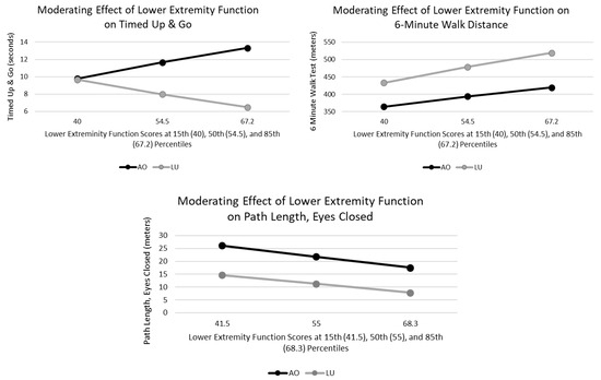 While no significant differences existed between groups for percent body fat, 2MWT, GLTQ, or SWD, the LU group outperformed the AP group during the TUG and 6MWT (p < 0.05). Furthermore, the LU group scored significantly higher on LEF compared to the AO group (p < 0.05), Table 2.