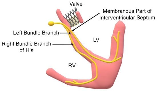 The anatomical proximity of the cardiac conduction system (CCS) to the aortic ring explains the frequent conduction complications after TAVR (Figure 1). Atkinson et al. created a three-dimensional model of the heart in which the bundle of His and its left branch, located in the membranous part of the interventricular septum, are particularly vulnerable structures [38,39].