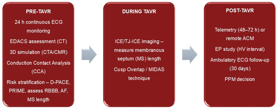 Conduction disturbances after TAVR may be asymptomatic, so early detection and monitoring is crucial. Continuous ECG monitoring for at least 24 h prior to surgery is recommended, which may help to identify latent arrhythmias and allow faster implementation of appropriate management [130].