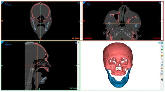 CT scan data in DICOM format were segmented to isolate the skull, upper jaw, and lower jaw structures, removing unnecessary anatomical regions and converting the segmented data into 3D STL format using Materialise Mimics software version 23.0 (Materialise NV, Leuven, Belgium) (Figure 2).