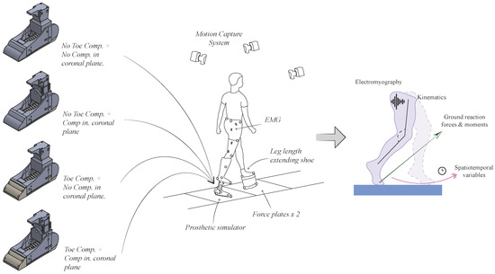 Experimental setup for the gait trials with its inputs and outputs. The effects of the presence and absence of toe compliance and compliance in the coronal plane were assessed for gait kinematics, ground reaction forces, spatiotemporal variables, and electromyographic signals.