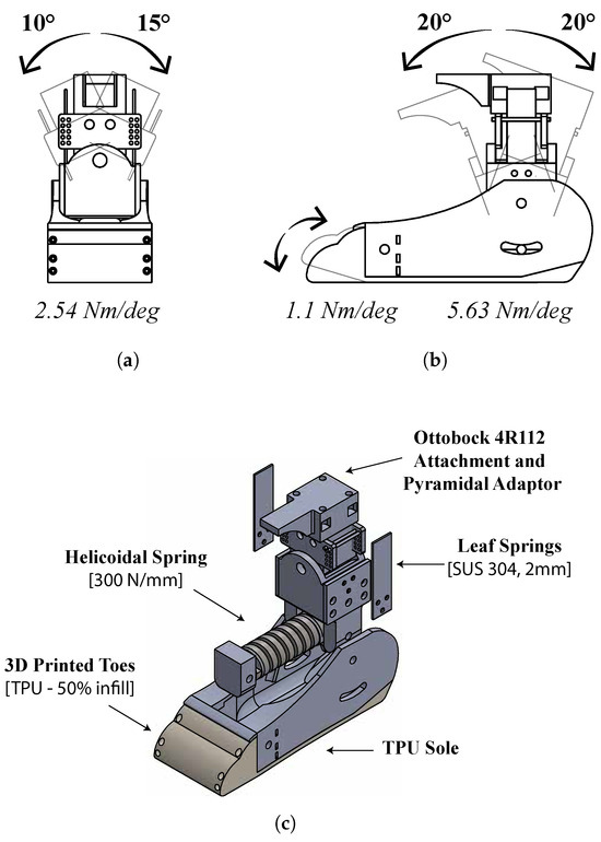 (a) Frontal, (b) lateral, and (c) isometric CAD of the prosthetic foot and its components.