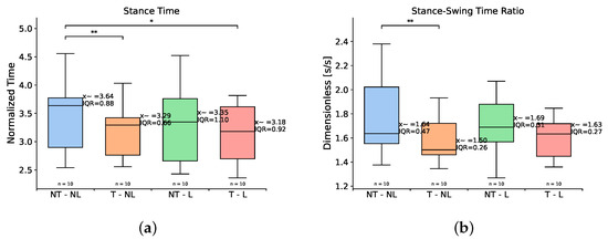 (a) Stance time and (b) stance/swing ratio boxplots for the different compliance variants over the gait trials (T: toe compliance; L Lateral compliance; NT: no toe compliance; NL: no lateral compliance). * indicates a p-value < 0.05, ** indicates a p-value < 0.01.