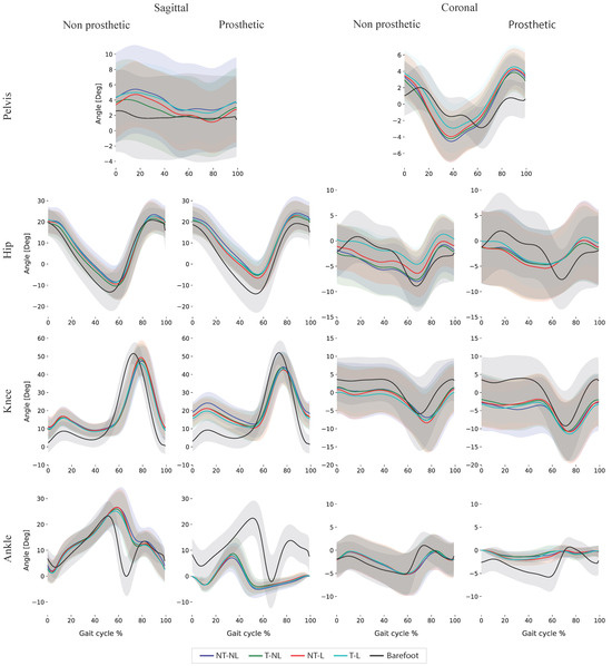 Pelvis, knee, hip, and ankle kinematics in the sagittal and coronal planes under the different compliance conditions during the gait trials. The curve shown in black corresponds to barefoot walking. The shaded areas correspond to the standard deviation of the curves.
