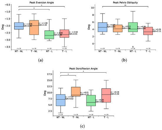 Peak (a) eversion, (b) pelvis obliquity, and (c) dorsiflexion boxplots for the different compliance variants over the gait trials (T: toe compliance; L: Lateral compliance; NT: no toe compliance; NL: no lateral compliance). * indicates a p-value < 0.05, ** indicates a p-value < 0.01.