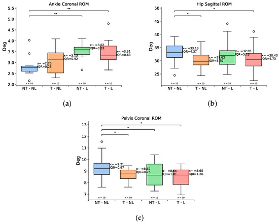 (a) Ankle coronal range of motion, (b) hip sagittal range of motion and (c) pelvis coronal range of motion boxplots for the different compliance variants over the gait trials (T: toe compliance; L: Lateral compliance; NT: no toe compliance; NL: no lateral compliance). * indicates a p-value < 0.05, ** indicates a p-value < 0.01.