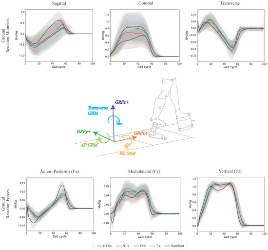 Sagittal (around the mediolateral axis), coronal (around the anteroposterior axis), and transverse (around the vertical axis) moments along with the ground reaction forces in the anteroposterior, mediolateral, and vertical directions under the different compliance conditions during the gait trials. The control curve, shown in black, corresponds to barefoot walking. The shaded areas correspond to the standard deviation of the curves.