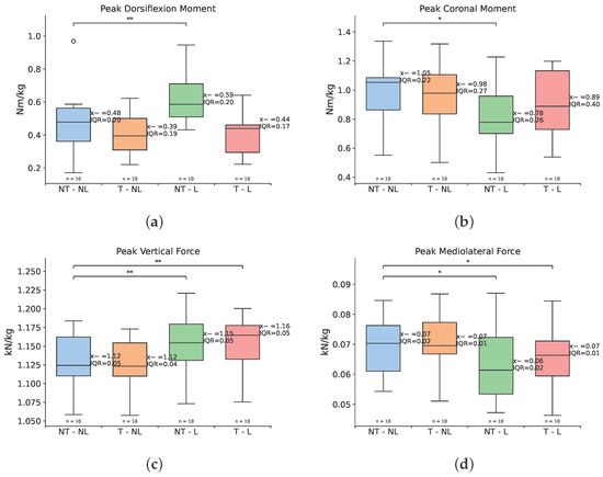 Peak (a) dorsiflexion moment, (b) coronal moment, (c) vertical force, and (d) mediolateral force for the different compliance variants over the gait trials (T: toe compliance; L: Lateral compliance; NT: no toe compliance; NL: no lateral compliance). * indicates a p-value < 0.05, ** indicates a p-value < 0.01.