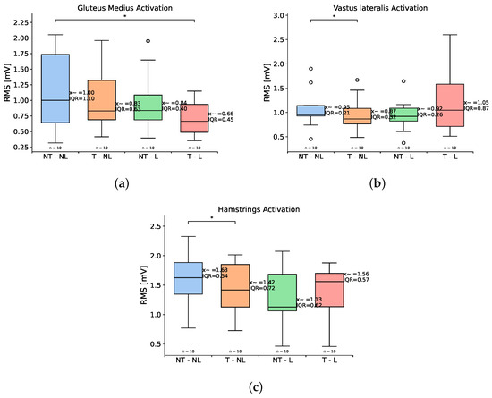 The different compliance and mobility conditions exerted a significant effect on the activity of the gluteus medius (Figure 10) on the non-prosthetic side and in the vastus lateralis and hamstrings on the prosthetic side (Table 5). The activity of the gluteus medius, which plays a major mediolateral role during gait and controls pelvis stabilization and posture, decreased as mobility increased, as observed in Figure 10. We observed a decrease of 0.17 µV in the T-NL condition, which seems to be enhanced by the use of lateral compliance, leading to a further decrease of 34% for the T-L condition compared to the baseline foot. However, the reduction effect is only significant for the T-L condition.