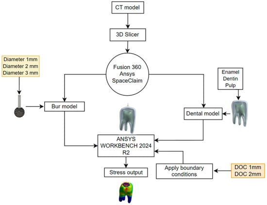 As shown in Figure 1, a dental model was generated using CT data acquired using a I-CAT 17-19 scanner (imaging Science international LLC, Hatfield, PA, USA). The DICOM-format images were processed using 3D Slicer software, version 5.2.2 (Brigham and Women’s Hospital, Harvard Medical School, Boston, MA, USA), an open-source medical imaging platform. The DICOM and Communications in Medicine format of the CT images was used to model the actual tooth structure. As this was a computational study based on a single anatomical model derived from CT data, randomization was not applicable. Similar simulation-based approaches have been reported without randomization []. The images were processed using the 3D Slicer open-source software. The software was used for image analysis and scientific visualization. The DICOM CT images were opened in a 3D slicer, and the model was generated. The original CT-derived model included an anatomically accurate crown morphology with grooves, pits, cusps, and ridges. However, during the geometry cleaning and preparation phase, these surface details were intentionally smoothed using Fusion 360 and ANSYS SpaceClaim 2024 to facilitate the mesh quality, convergence, and solver stability in an explicit dynamic simulation environment. Highly detailed surfaces tend to produce complex, irregular element shapes that lead to excessive simulation time, non-physical stress concentrations, or convergence failure. The dental structural model, enamel, dentin, and pulp were considered at a distance of 1 mm from the top surface. The dental structure and its components are shown in Figure 2a. As the tooth selected is the upper first molar, the tooth structures are shown as in Figure 2b with the crown directed downwards. A diamond-coated round bur tool was modeled to analyze the cavity preparation in the tooth structure. The grit arrangement is assumed to be compatible with the simulation results. The assumed bur was modeled using Fusion 360. In the current analysis, we considered three models with diameters of 1 mm, 2 mm, and 3 mm. The modeled burs cover a wide range and are commonly used in cavity preparation and tooth cutting. Smaller burs were used for fine and precise cavity access, whereas larger burs were used for material removal and tooth shaping. In addition, these ranges allowed us to investigate stress distribution during the procedure for cutting efficiency and structural impact on dental structures. Figure 2b shows the assumed diamond round-bur model with a defined diameter. The assembly of the bur and dental structure models is shown in Figure 3. These models were used for simulation in ANSYS Workbench 2024 R2. The minimum distance between the burs and the teeth was maintained to avoid a longer simulation time.
