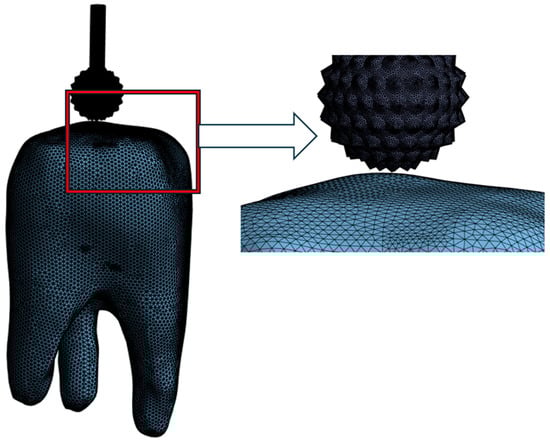 Figure 4 shows the meshed model. Four nodded tetrahedral elements were adopted for meshing. Table 1 presents the quantities of nodes and elements. The behavior of the bur is characterized as rigid, whereas the dental structure is regarded as deformable or flexible.