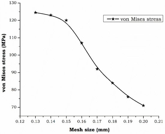 Figure 5 presents the grid independence study conducted during the simulation of the dental bur cavity access preparation. The research focused on altering the elemental mesh size to assess its impact on simulation outcomes, aiming to identify the least computational resources needed to produce precise and dependable outcomes. During the explicit simulation, the mesh size was varied between 0.1 mm and 0.2 mm. The selected range was chosen to evaluate the impact of varying levels of discretization on the computed stress values. The maximum von Mises stress on the enamel served as the standard for determining grid independence. Through multiple reiterations, it was observed that 0.15 mm mesh size consistently produced reliable outcomes. This mesh results offers ideal stability among computational speed and the detail required for precise simulation. This mesh size enables the formation of nodes and elements for the simulation [,]. Figure 4 presents the mesh, illustrating the discretization of the bur and dental structure. Table 1 provides the specification of the models, including the number of elements and nodes.