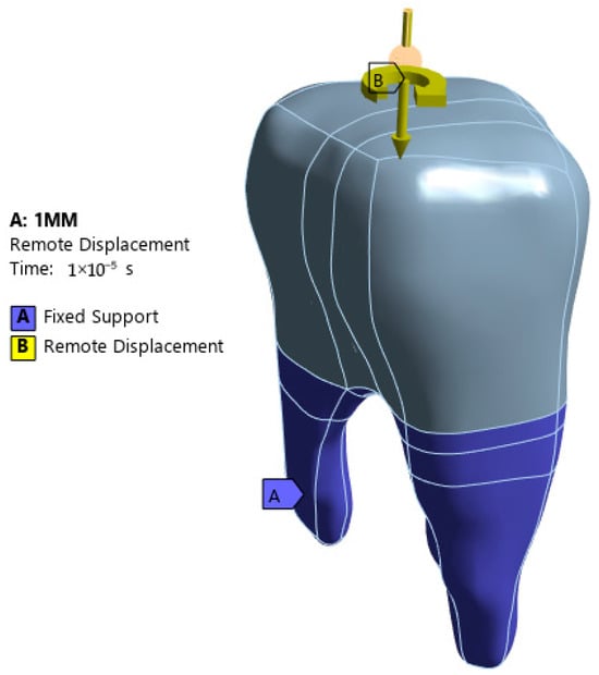 In the current study, the bur was rotated by providing an angle of rotation, and the lower surfaces of the teeth were fixed in all directions [Figure 6]. An ANSYS workbench was used to conduct explicit dynamic analysis. The erosion properties were enabled for short-term simulations. As shown in Figure 6, the tooth surface was fixed with all degrees of freedom. The 360-degree angular rotation and depth of cut (DOC) in the displacement format were added to the remote displacement loading condition. The analysis was performed at two different cutting depths. A 1 mm DOC is often used for initial access and precise cutting, while a 2 mm DOC is used for deeper material removal or cavity shaping. By comparing the two DOC, we analyzed the stress distribution and its effects on the dental structure.