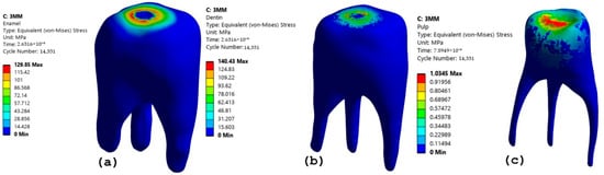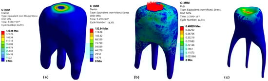 Stress pattern for a bur diameter of 3 mm and a DOC of 2 mm in (a) Enamel (b) Dentin (c) Pulp.