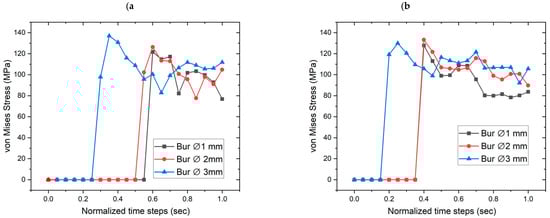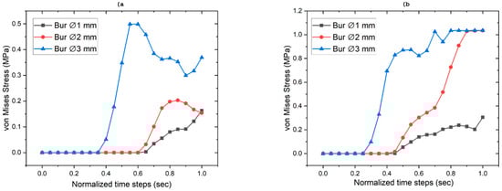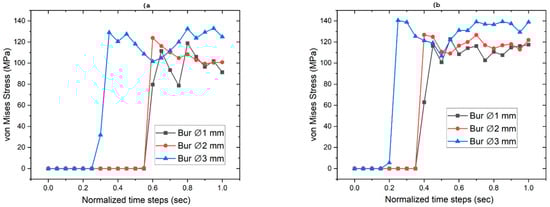 Figure 16 presents the von Mises stress distributions in enamel, dentin, and pulp for different bur diameters (1, 2, and 3 mm) at two depths of cut [DOC 1 mm in Figure 16a and DOC 2 mm in Figure 16b]. The stress values for the enamel, dentin, and pulp were visually compared for each bur size. Figure 16a shows that the stress values in the enamel and dentin are nearly equal for all bur diameters. The stress in the pulp was lower than that in the enamel and dentin. However, a distinct pattern of increasing stress was evident with both increasing bur diameter and depth of cut. For the 1 mm bur at 1 mm DOC, the pulpal stress was recorded at approximately 0.160 MPa, while at 2 mm DOC it increased to 0.305 MPa. The 2 mm and 3 mm burs produced higher pulpal stress values, reaching 1.034 MPa and 1.036 MPa, respectively, at 2 mm DOC. Similarly, Figure 16b shows that the stress levels were high for all the bur sizes. The dentin stress is higher than the enamel bur diameters, which contrasts with the trends shown in Figure 16a, because dentin acts as the primary load-bearing tissue for deeper cuts or DOC. The stresses in the pulp remain negligible compared to those in the enamel and dentin; however, the trend shows that as the DOC increases, the pulp stress becomes more significant during cavity preparation. Although these stress magnitudes are relatively low and unlikely to cause immediate damage, the trend indicates that larger burs and deeper cuts can transmit stress to the pulp through dentin, especially in deep cavity preparations. This suggests that repeated procedures or insufficiently cooled environments can influence pulpal health over time. From Figure 13, it can be concluded that minimizing DOC and using appropriate bur sizes helps to reduce stress accumulation and avoids excessive enamel and dentin damage.