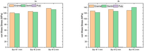 Comparison of von Mises stress distribution in enamel, dentin, and pulp with different bur diameter (a) for DOC 1 and (b) DOC 2.