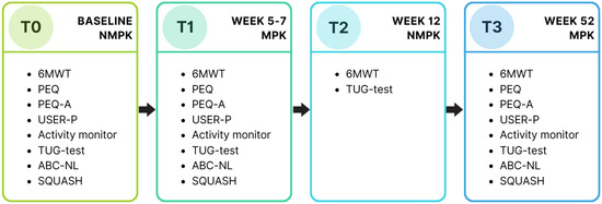 In total, the participants were monitored for a year and performed four measurements. The first two measurements of this study were integrated into the standard care process and are described in this paper. Two follow-up measurements after the trial period will be published separately. A baseline measurement (T0) was performed while the participants were using their own NMPK (Figure 2). One week later, they received an MPK to start the trial period. During this trial period, they received 30 min of physical therapy twice a week. In the last week of the trial period, all measurements were repeated while using the MPK (T1). After the trial period, participants switched back to their NMPK, and after four weeks of getting used to that, the six-minute walking test (6MWT) and timed up and go test (TUG-test) were repeated (T2). In the case that the application for an MPK was approved by the health insurance company and the participant started using the MPK, the measurements were repeated again (T3), nine months after T2. A timeline of the measurements is displayed in Figure 2.