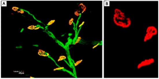 Histological demonstration of axon growth and formation of neuromuscular junctions within the RPNI. (A) Regenerating axons are highlighted in green through immunostaining with anti-neurofilament 200. (B) Neuromuscular junctions are visualized in red using fluorescently labeled alpha-bungarotoxin [9].