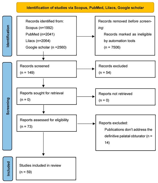 In the Google Scholar search, 304 publications were found containing the keywords “palatal obturator”, “years old”, “follow-up”, and “not child”, meeting the time criterion. By adding the keywords “impression OR cast OR fabrication” to identify publications describing the fabrication phases of the palatal obturator, 123 publications were retrieved. Among these, 3 were excluded due to unavailability, 31 for being unrelated to the topic, 1 for overly generic statistical data, 5 for lack of subjects, 5 for missing subject information, 8 for unspecified pathology, 2 for including minors, 1 for lack of periodic follow-ups, 5 for being duplicates within Google Scholar, 2 for being duplicates in PubMed, and 1 for being a duplicate in Lilacs. After these exclusions, 59 publications were included, of which only 47 specifically featured a definitive palatal obturator as the type of prosthesis.