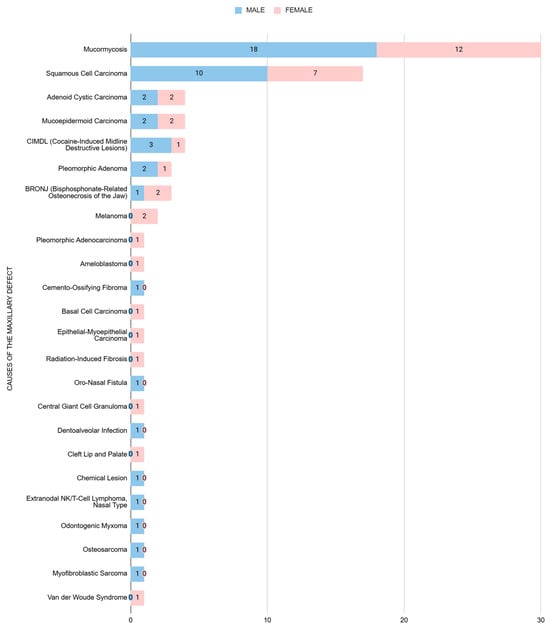 Bar chart showing the number of individuals affected by each pathology causing the maxillary defect, categorized by gender.