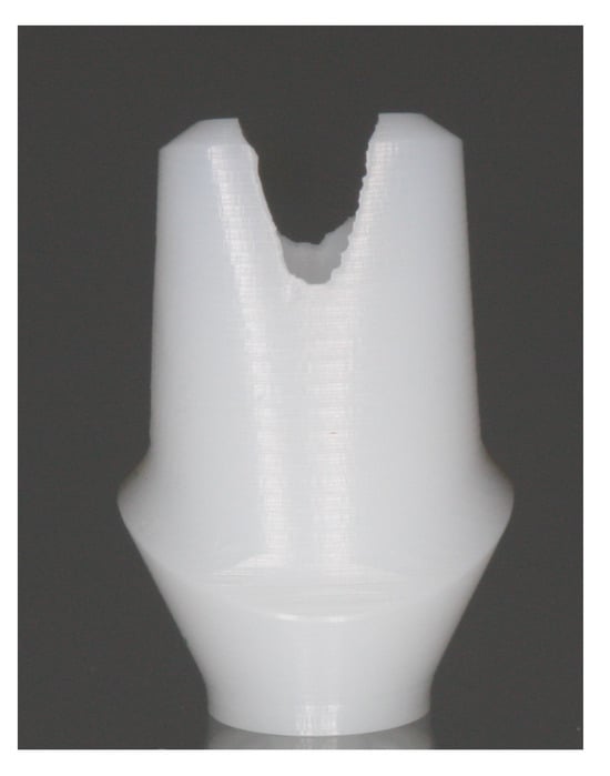 The analysis of different abutment-to-implant connection materials is important to achieve a stable abutment connection (IAC), which is a key factor for long-term clinical success from both biological and mechanical points of view [9,33]. The fracture rate seems to be influenced by the design of the internal or external connection [16]. Two other studies reported fractures at the junction level and showed how the junction interfaces in zirconia abutments could be improved [24,25]. Fractures at the junction level appear to be a weakness of this abutment type, so a change in the design of the junction platform could improve its performance and fatigue strength [25].