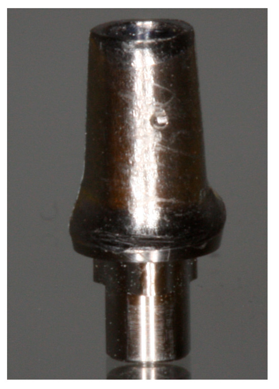 Figure 2 and Figure 3 show the difference between a standard screw abutment with an internal connection and platform switch concept and a new zirconia abutment. In this case they were milled by a technician and cemented to a connector extra-orally. This was a two-piece abutment with a metal adapter, so the abutment–implant interfaces were titanium versus titanium.