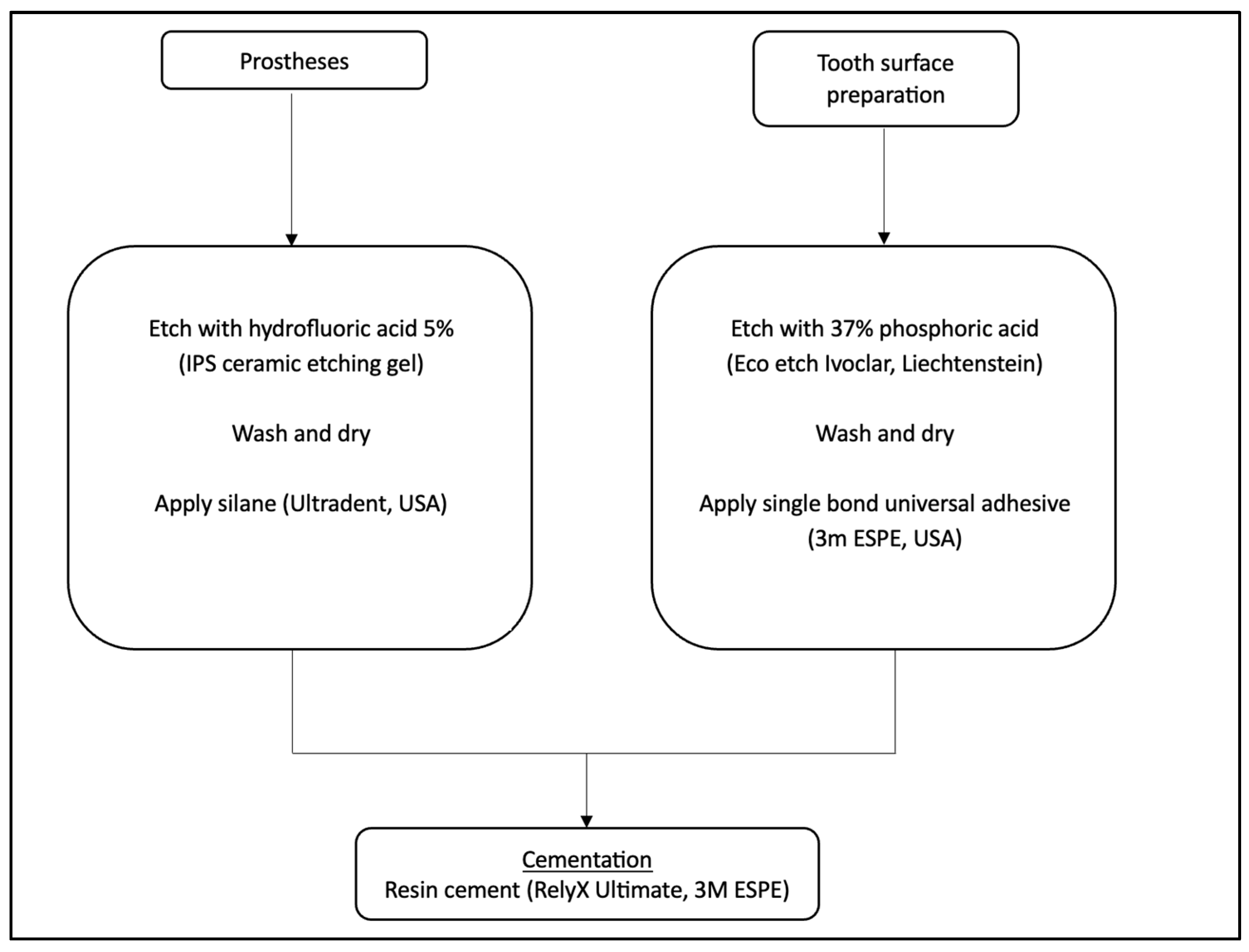 - Botelho, M.G.; Ma, X.; Cheung, G.J.K.; Law, R.K.S.; Tai, M.T.C.; Yu Hang Lam, W. Long-term clinical evaluation of 211 two-unit cantilevered resin-bonded fixed partial dentures. J. Dent. 2014, 42, 778–784. [Google Scholar] [CrossRef]