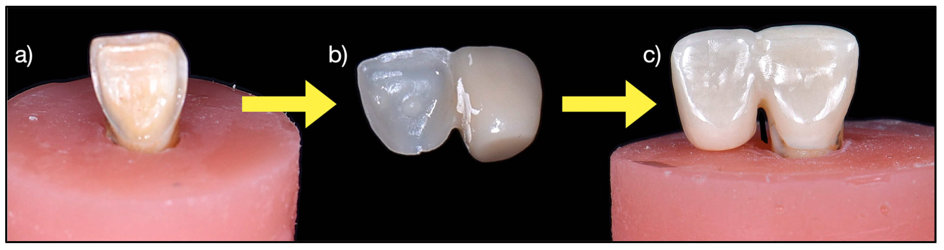 - Zlatarić, D.K.; Soldo, M. Considerations for conservative, all ceramic prosthodontic single tooth replacement in the anterior region: A systematic review. Dent. J. 2025, 13, 219. [Google Scholar] [CrossRef]