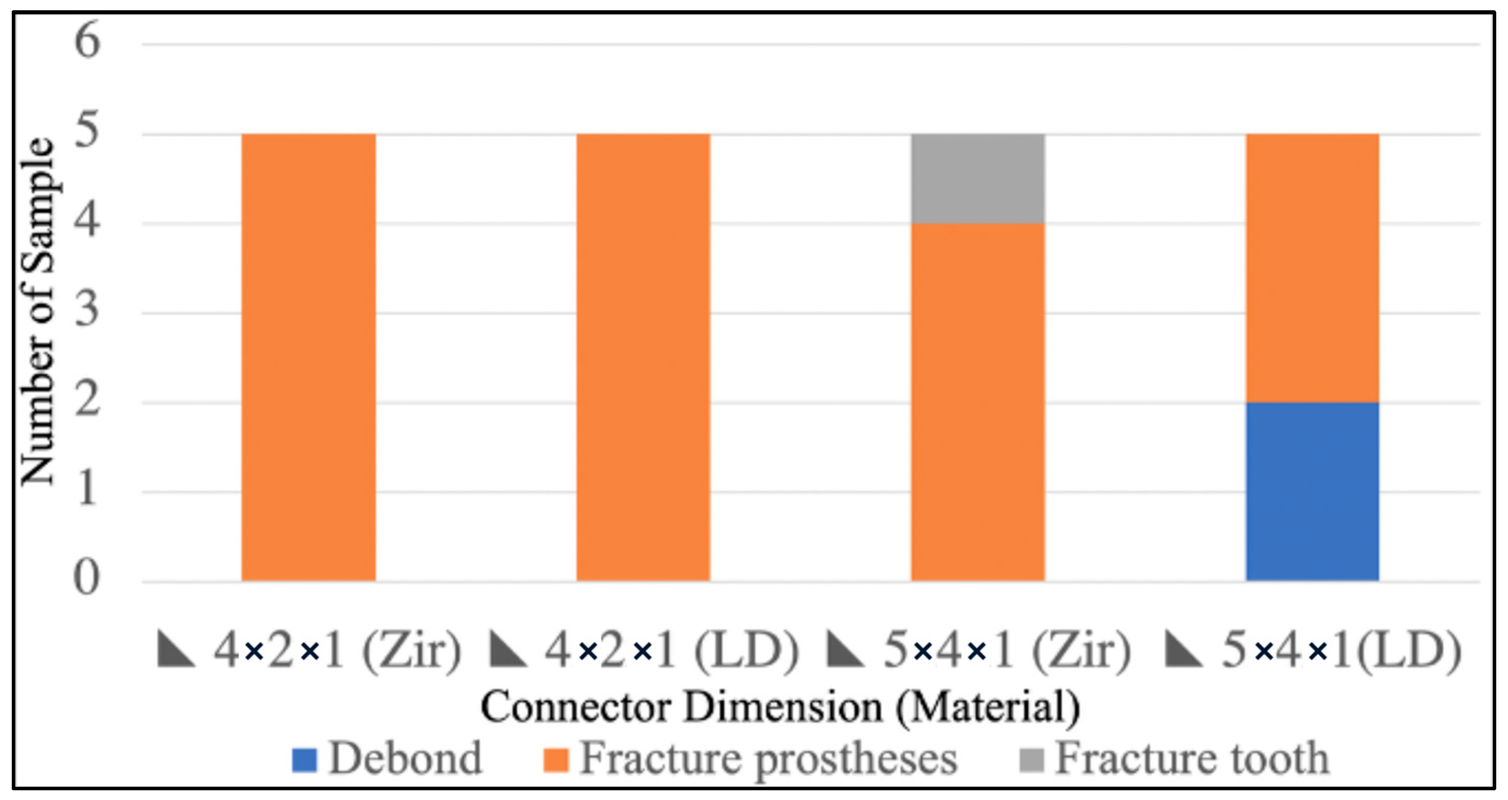- Hafezeqoran, A.; Koodaryan, R.; Hemmati, Y.; Akbarzadeh, A. Effect of connector size and design on the fracture resistance of monolithic zirconia fixed dental prosthesis. J. Dent. Res. Dent. Clin. Dent. Prospect. 2020, 14, 218–222. [Google Scholar] [CrossRef]
