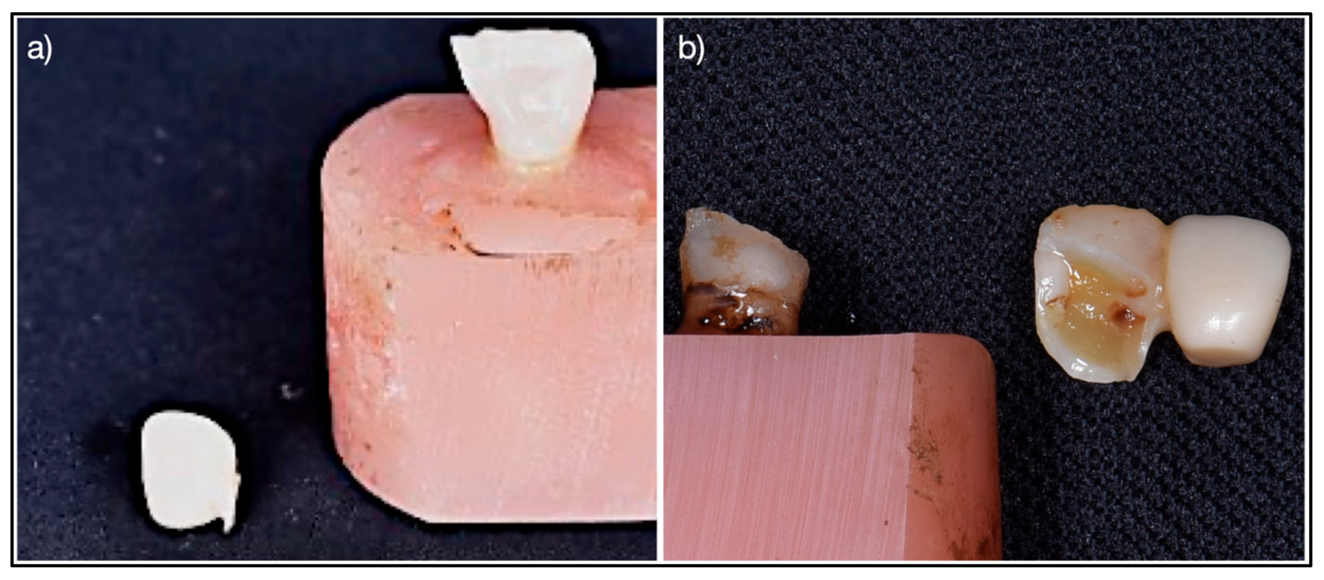 - Gresnigt, M.M.; Tirlet, G.; Bošnjak, M.; van der Made, S.; Attal, J.-P. Fracture strength of lithium disilicate cantilever resin bonded fixed dental prosthesis. J. Mech. Behav. Biomed. Mater. 2020, 103, 103615. [Google Scholar] [CrossRef] [PubMed]