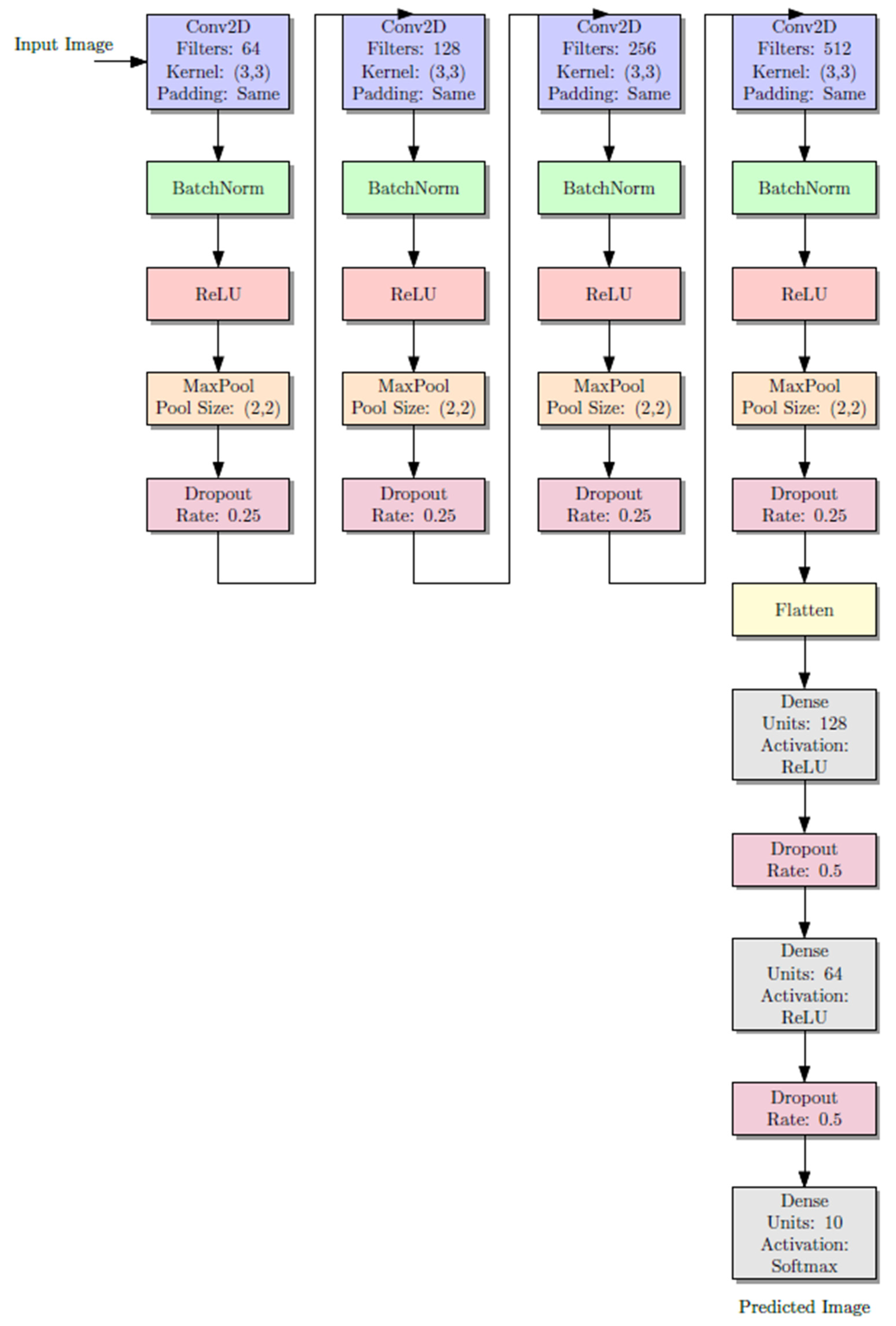 In order to combat overfitting, dropout layers (rate 0.5) were used. The last output layer was a fully connected dense layer with a SoftMax activation function for multi-class classification. The SoftMax equation is shown as follows.