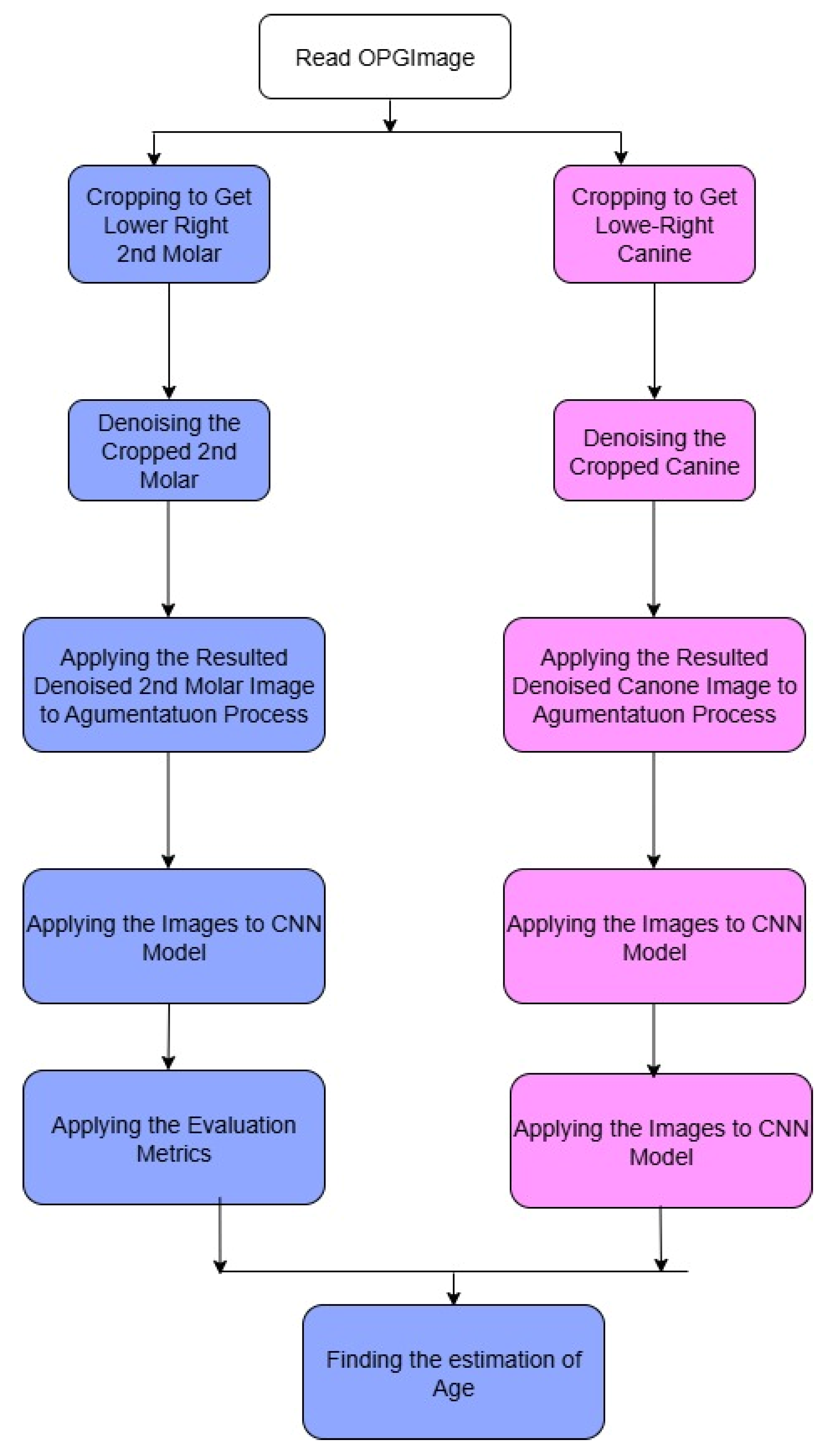 Figure 4 shows the complete architecture prediction pipeline. The duplication of the CNN input representation may have been misleading. We show two input- arrows to the CNN model (indicated by pink) to symbolize both canine and molar cropped images when are passed through the same CNN architecture for classification independently. These two streams are not identical; instead, they correspond to two kinds of ROI crops performed in distinct contexts of the pipeline.